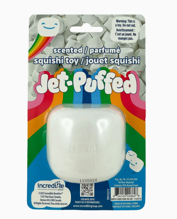 Jet Puffed Scented Squishy Toy are soft, sweet, and totally satisfying to squeeze! The Jet Puffed Scented Squishy Toy is designed to look and feel just like a fluffy marshmallow. Made from ultra-soft, slow-rising material, this squishy is perfect for stress relief, sensory play, or just plain fun. Each squishy features a delightful scent that adds an extra layer of enjoyment with every squeeze. Perfect for kids, collectors, and squishy fans of all ages, it’s great for playtime, desk décor, party favors, or gift baskets. Once you squish it, you won’t want to put it down!